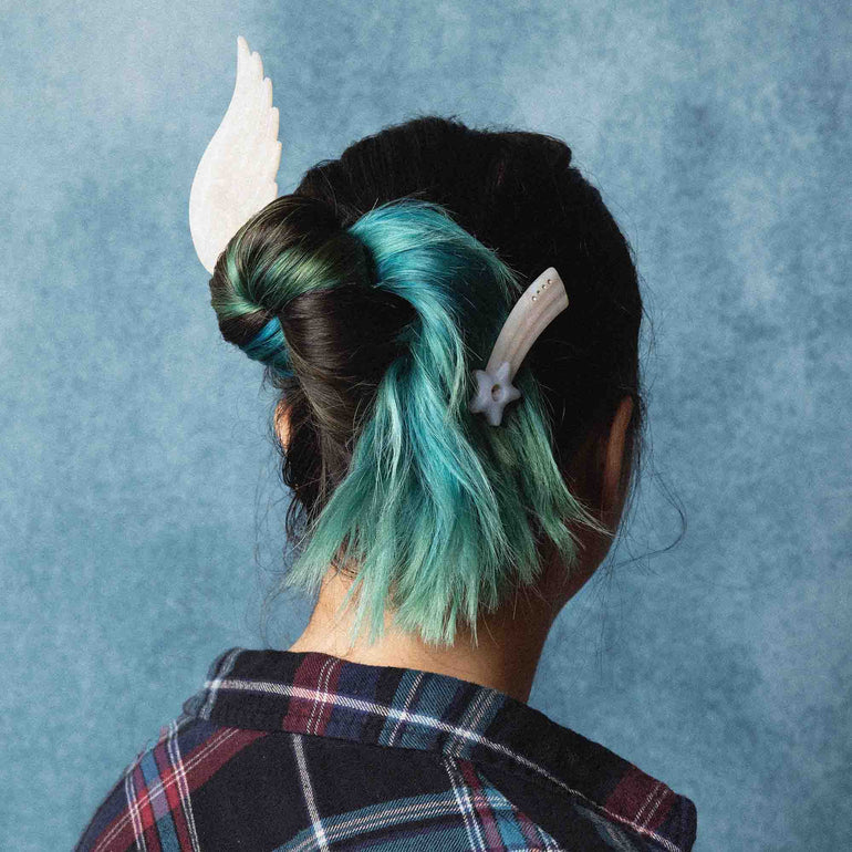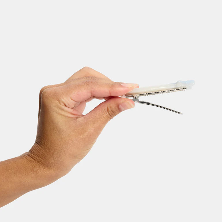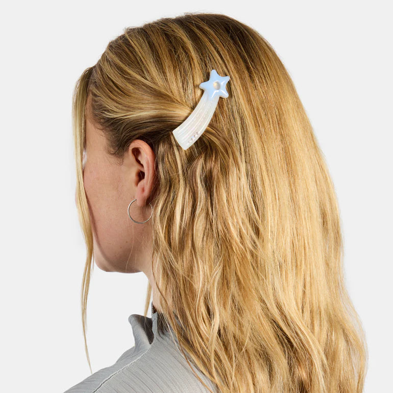 Add a dreamy touch to your look with a pair of shooting stars, featuring a unique slot to slip in a tiny photo or keepsake. Made with a glossy, pearlescent finish and accented with sparkling rhinestones. The alligator clips provide a strong hold with no snag. Ideal for all hair types and lengths. Great for taming bangs and flyaways.