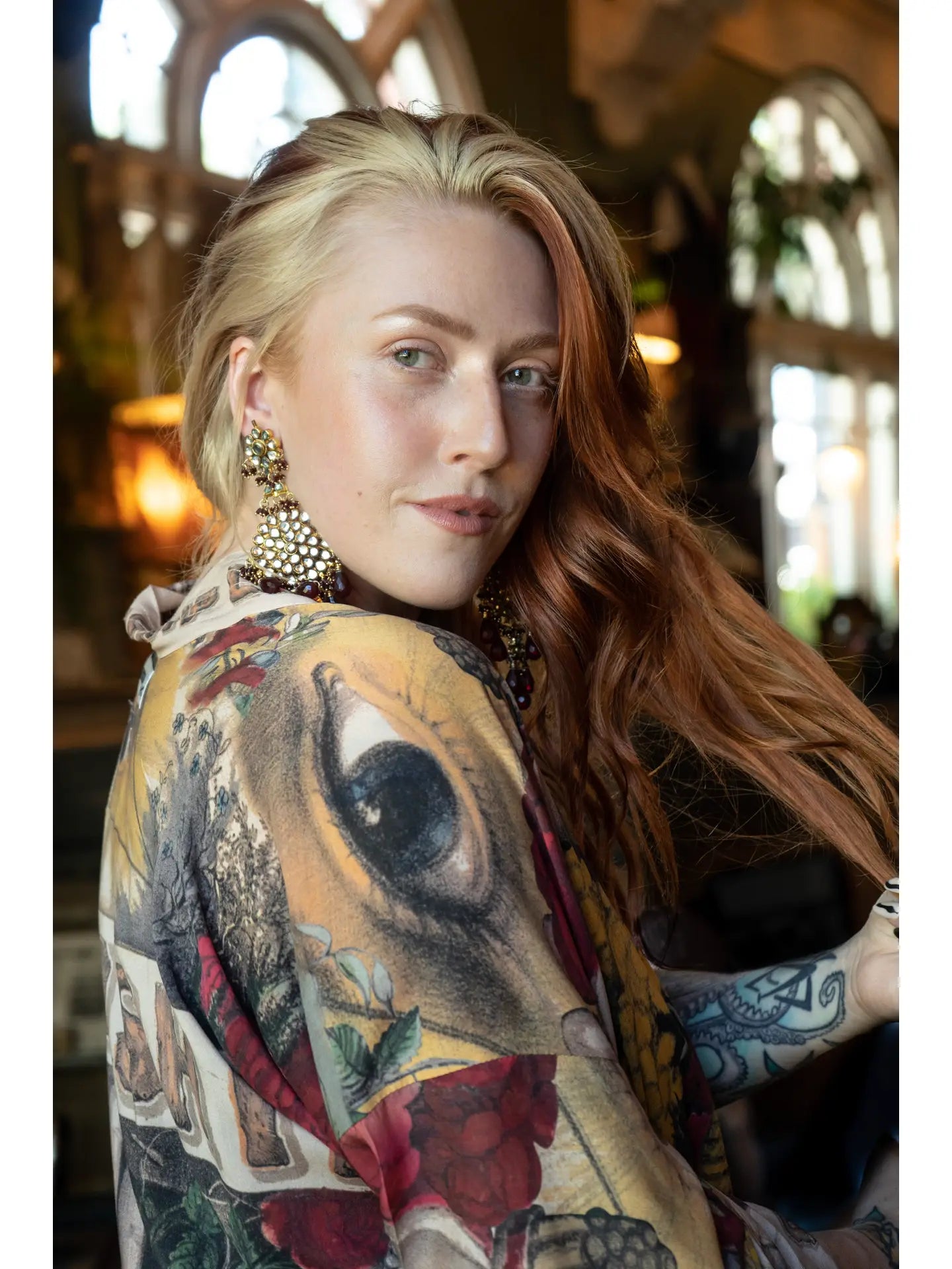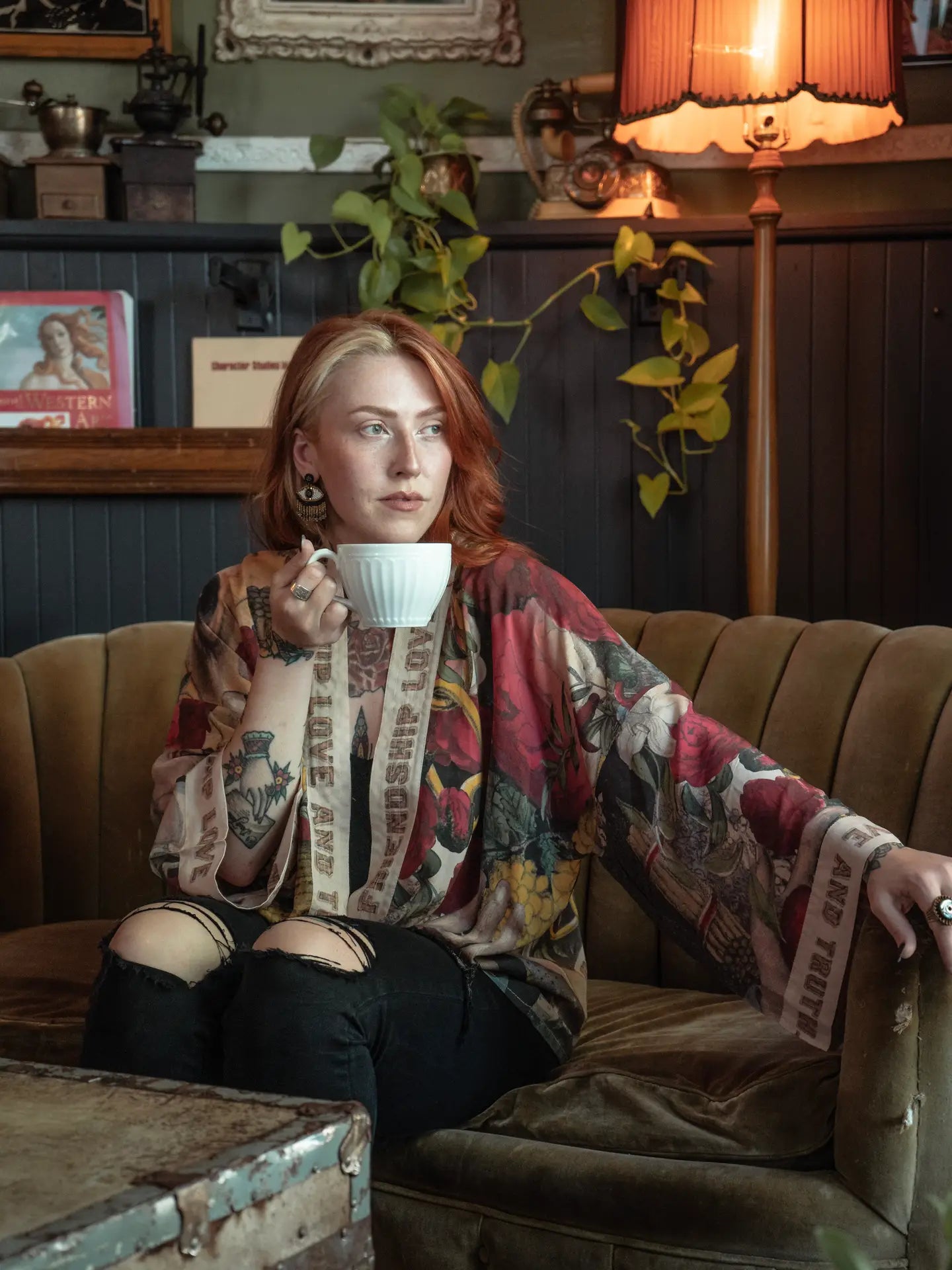It takes a bold heart to live your truth. To keep reminding yourself that love is the answer, even on your hard days! We created this eclectic, super cool kimono from an 1880s archival print, and adapted the utterly charming wood-grain lettering to build the trim. The result is one of our favorite pieces in the collection: beautiful and completely unique, with a lot of romance, and a touch of rock and roll. There are so many delightful images on this kimono, many of which are historic symbols of friendship, love, and truth! The beehive traditionally represents cooperation, and the bundle of sticks is a symbol of teamwork and solidarity. The clasped hands signify trust and fellowship, and the heart-in-hand represents charity and kindness.