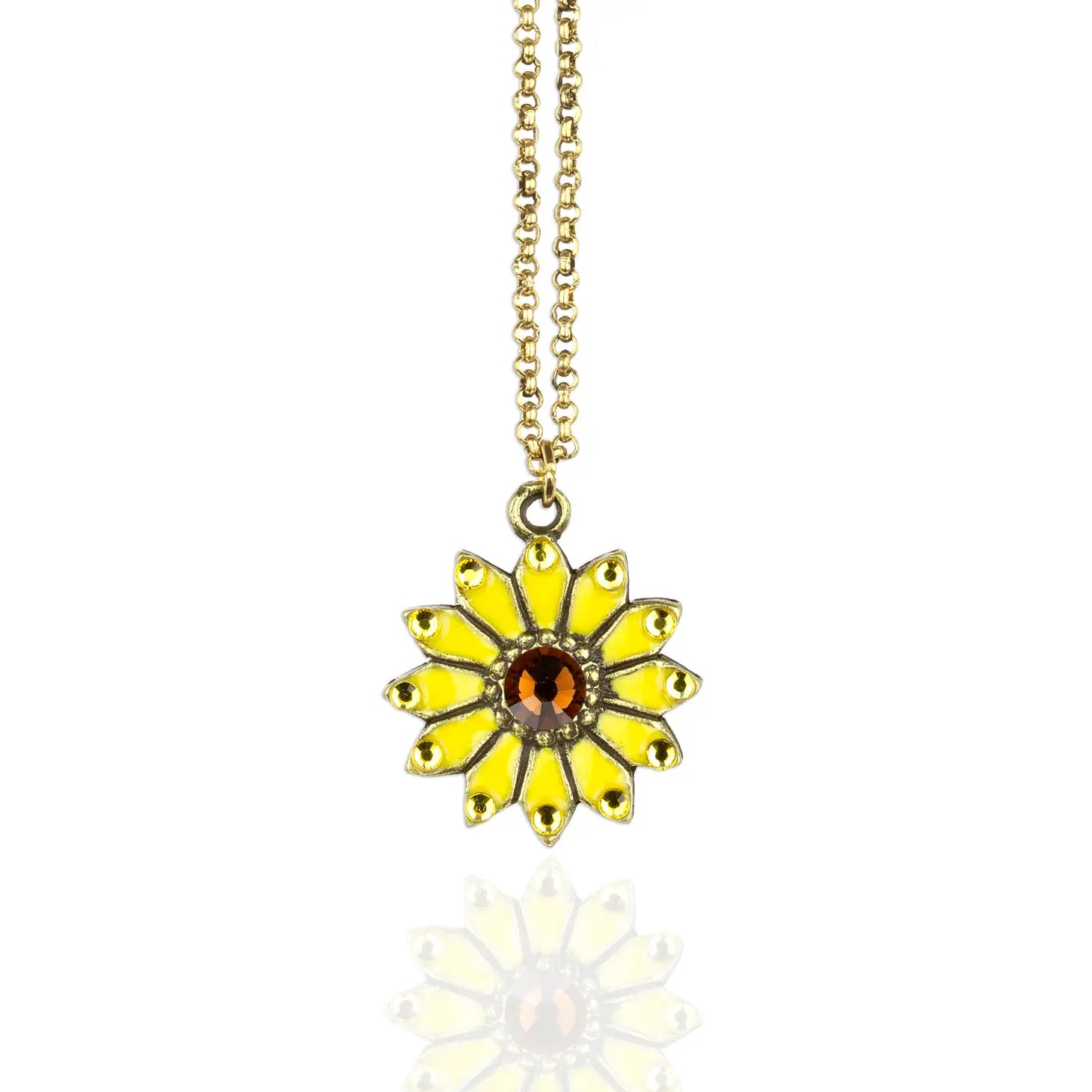 Brighten your day with this sunflower pendant. Featuring hand enameled petals with crystal accents, this necklace is a cheerful addition to any look.