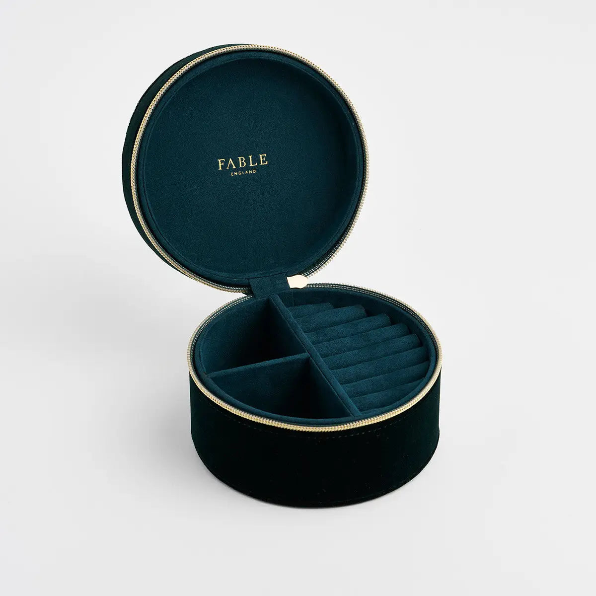 DESIGN DETAILS: This compact round jewellery box features a rich forest-green velvet-style polyester exterior embroidered with a detailed badger motif, bringing a touch of woodland magic to any dresser or travel bag. Inside, a soft polyester lining and eight ring slots provide gentle protection and organisation for delicate jewellery.