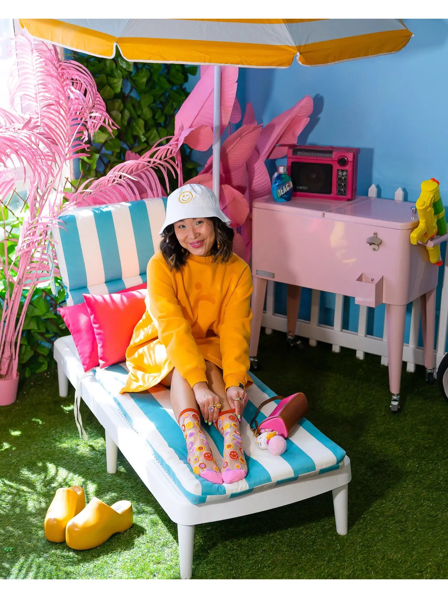Eye-catching smiley faces in pastel colors are guarantee to make your feet happy. Finished with a pink toe and heel for maximum cheerfulness.