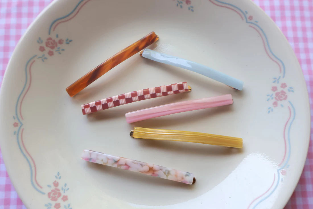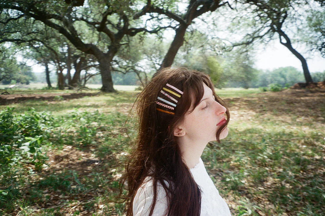 You’re a stone fox. Inspired by the character and color palette of Lux Lisbon, the Stone Fox Slides are a set of 6 line shaped slide clips on super strong, bobby pin style backers. Wear them all at once for a soft 70s color scheme or one at a time. Made for all hair types.