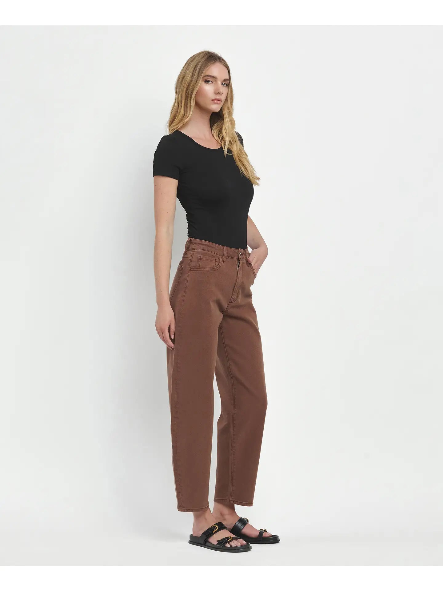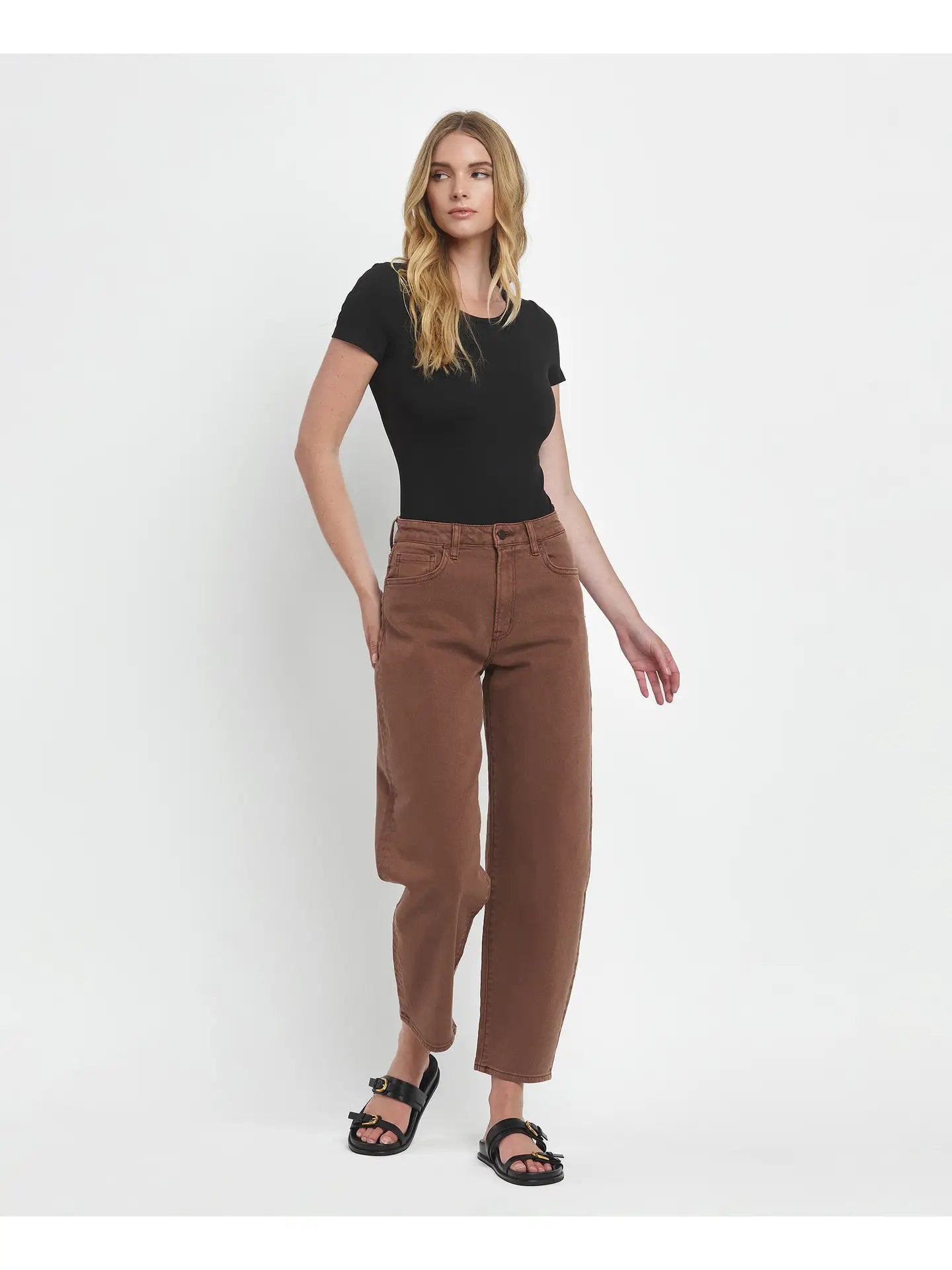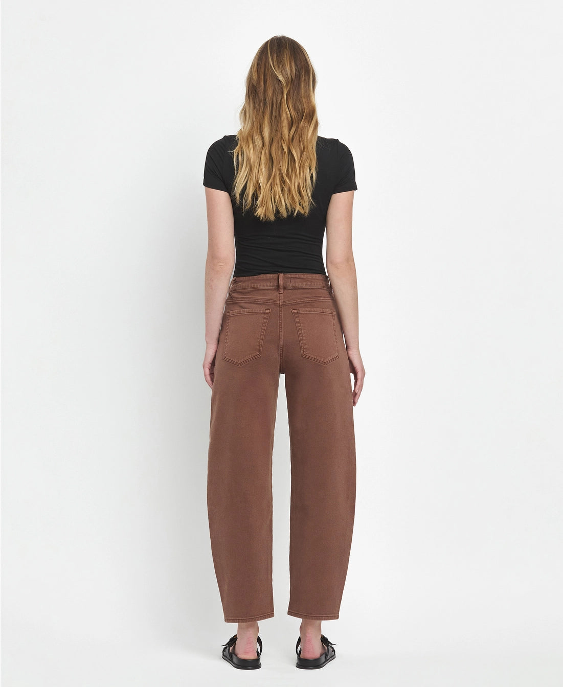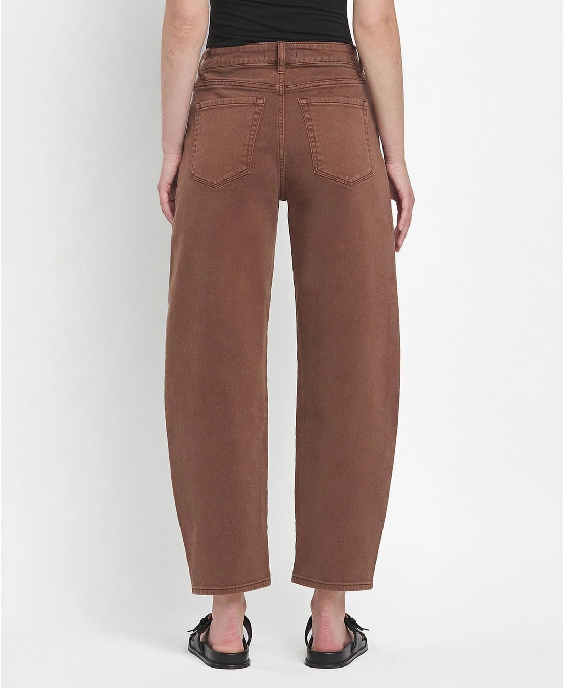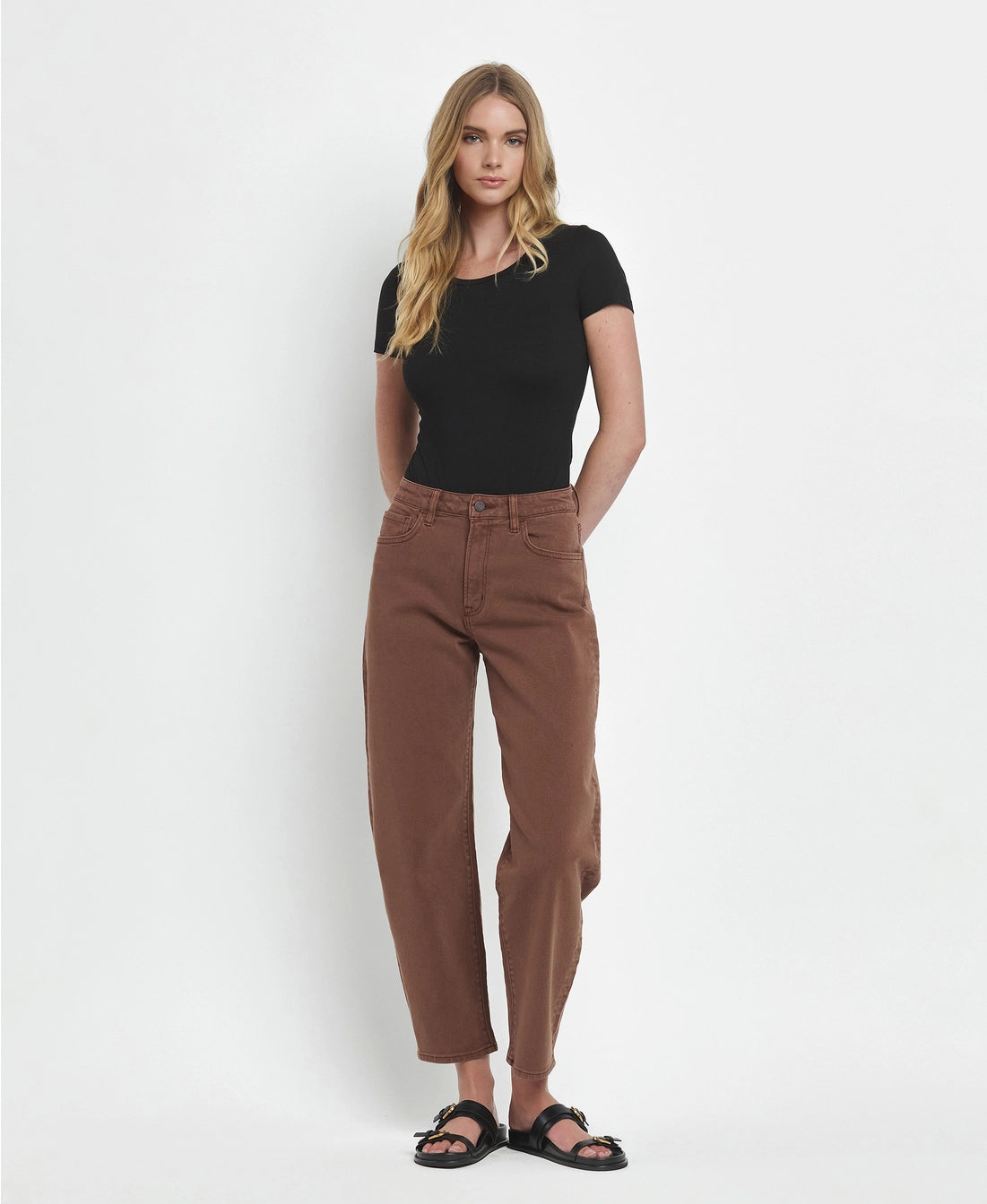 Comfort stretch denim, super high rise waist, finished hem, cropped length, slim barrel jeans.