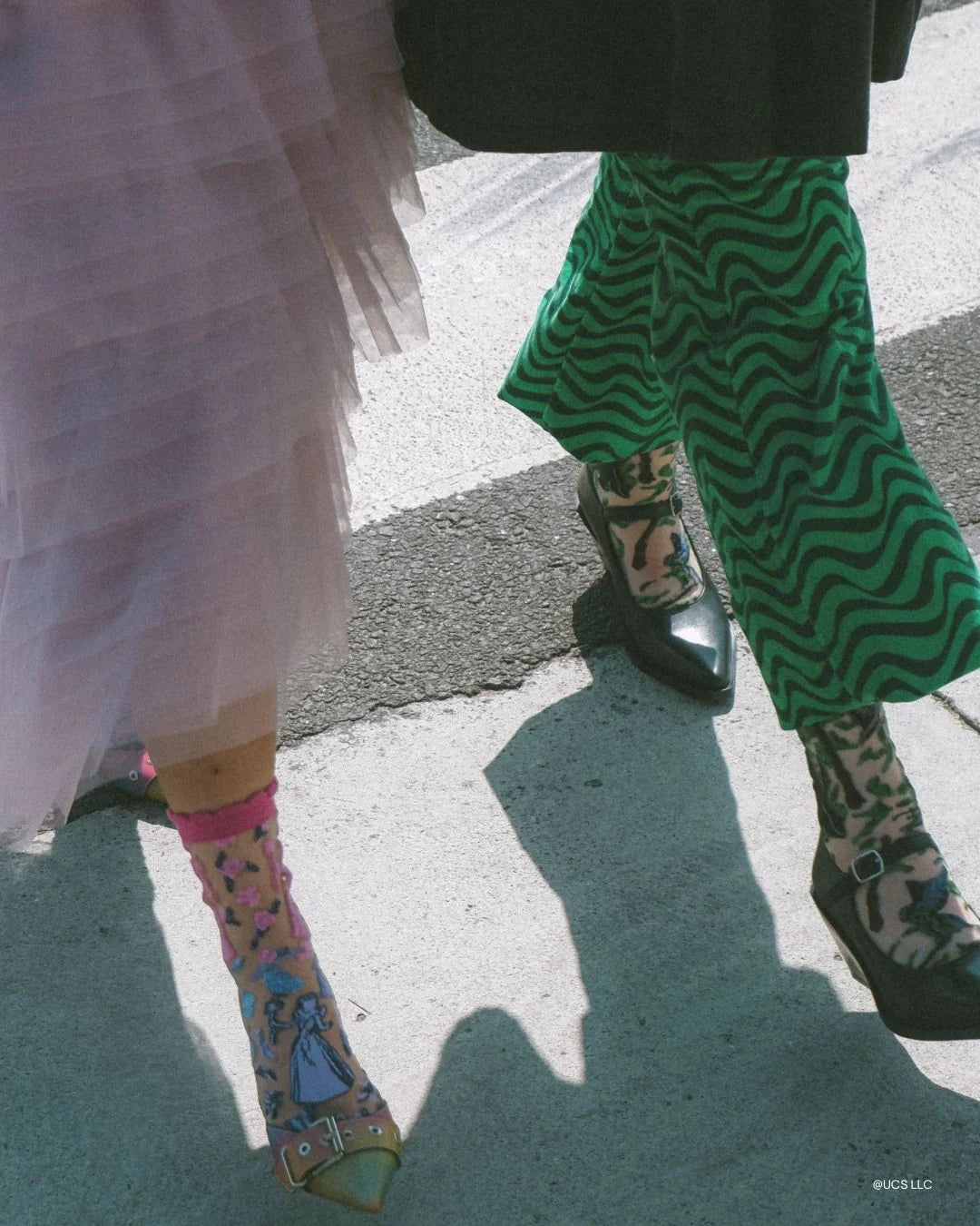 Defy gravity with the Elphaba Silhouette Sheer Crew Sock. This spellbinding design features dramatic silhouettes of Elphaba in her iconic hat and flowing cape, surrounded by swirling details of brooms, monkeys and leaves that echo her magical presence. Set against a sheer nude base with deep emerald and black, these socks capture Elphaba’s fearless spirit and signature style. A dark blue cuff, toe, and heel complete the design, making these the perfect accessory for fans who want to add a bold, witchy edge to their outfits.